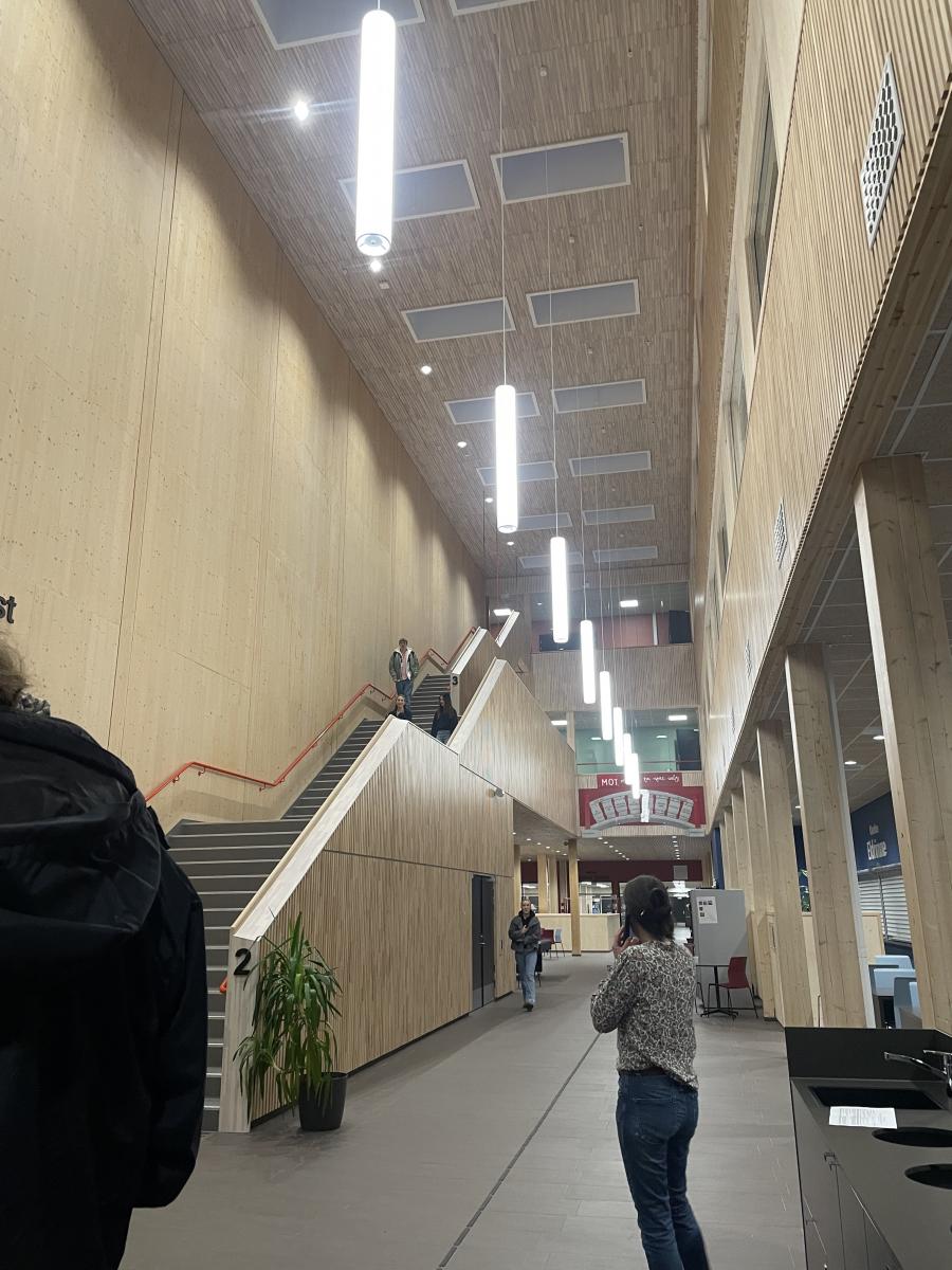 On the second day of our trip, the first visit to our partner school in Askøy was on the agenda. After a quick breakfast, we headed to the Møhlenpris bus stop at around 7:50 AM. When we arrived at Askøy Videregående Skole at around 8:20 AM, we were warmly welcomed and greeted by Ann-Elin. During a very informative tour through various areas of the school, we had some interesting and amusing conversations with students and teachers. Our first impressions of the school were impressive and overwhelming, as it was completely different in terms of design and structure compared to our school in Erfurt. We were particularly surprised by the small class sizes, the uniquely designed classrooms, the modern school concept, and the relaxed school environment. One of the most striking aspects was the excellent accessibility of the buildings, as well as the open and tolerant atmosphere. The facilities were equipped with tactile guidance systems, Braille signage, elevators, and other accessibility features. After the tour, we were divided into two groups and received a brief introduction to the Norwegian language, as well as an insight into the German lessons, where we got to know some of the students. We then became acquainted with the Norwegian MOT program („MUT program“ in German). Through various team-building exercises, we learned how to stand up for ourselves and others. After this interesting and educational day, we took the ferry back to Bergen at around 2:30 PM. Once there, we headed to a supermarket near our accommodation to buy groceries for dinner. Back at our accommodation, after a few hours of relaxation, we enjoyed a homemade curry prepared by Ben and Chris—thanks for that! Once again, the evening ended in a cozy atmosphere before everyone finally fell into bed.