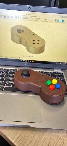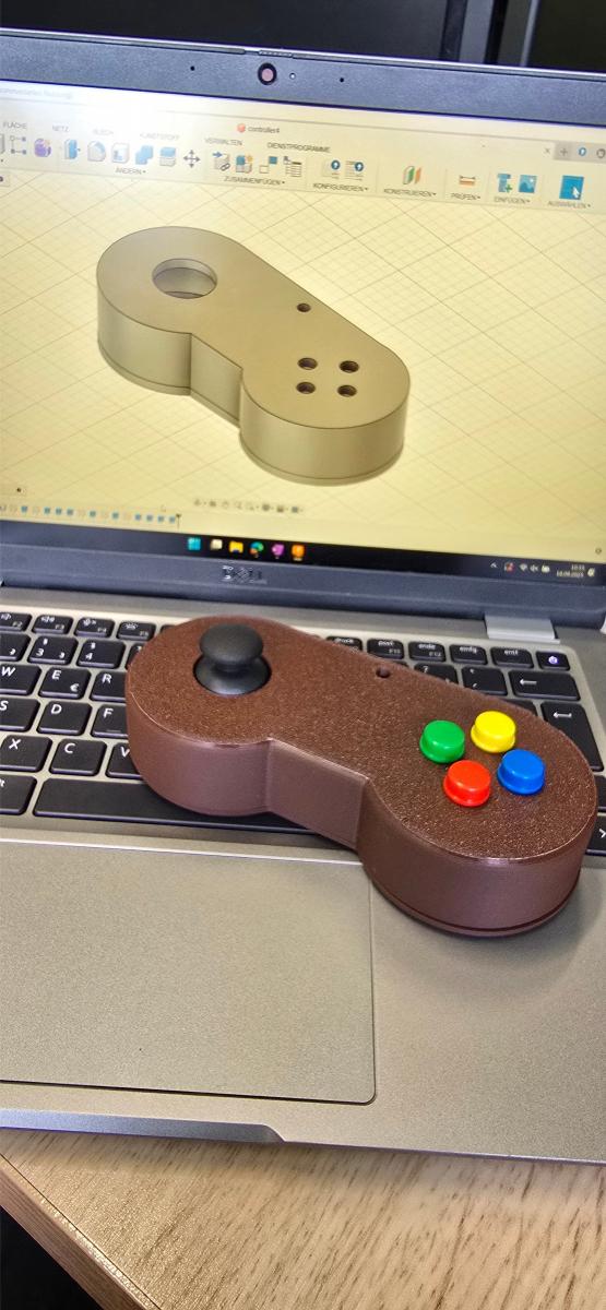 Wie schon an den vorherigen Tagen wurden die über Nacht gedruckten 3D-Modelle getestet und eingerichtet. Der Controller des Teams LED-Matrix war nun endlich auch in physischer Form vorhanden. Dieser erwies sich jedoch nicht als ganz fehlerfrei: Der Sockel für den Joystick war zu hoch gedruckt, konnte aber mit einem Cuttermesser schnell angepasst werden.