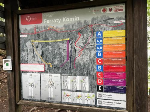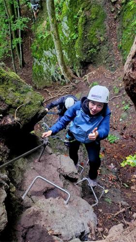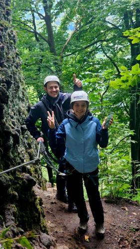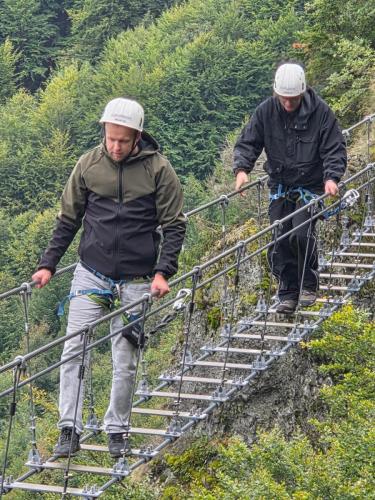 Gemeinsam gingen wir die Startroute über die Hängebrücke, die uns in schwindelerregender Höhe auf die andere Seite bringen sollte. Trotz Höhenangst mancher meisterten alle die Strecke mit Bravour. Danach ging es für uns weiter zu anspruchsvolleren Strecken, darunter u. a. der Kamin („Komín“), der den Schwierigkeitsgrad „C“ hatte. Die Schwierigkeit machte sich bereits bemerkbar, als wir uns die Strecke von unten anschauten … Trotz der Anstrengung schafften wir es durch den Kamin und kamen alle verschwitzt, aber erfolgreich, oben an.