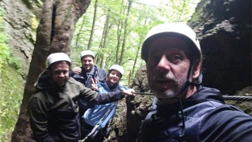 Together, we took the starting route over the suspension bridge, which was to take us to the other side at a dizzying height. Despite some of us being afraid of heights, everyone mastered the route with flying colors. After that, we moved on to more challenging routes, including the chimney (“Komín”), which had a difficulty rating of “C.” The difficulty was already apparent when we looked at the route from below… Despite the effort, we made it through the chimney and all arrived at the top sweaty but successful.