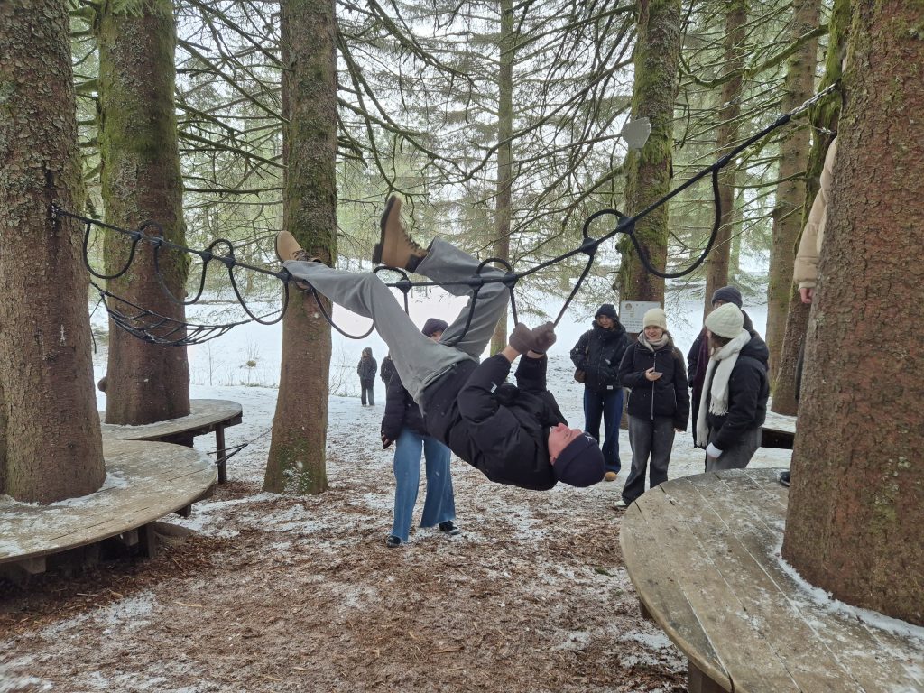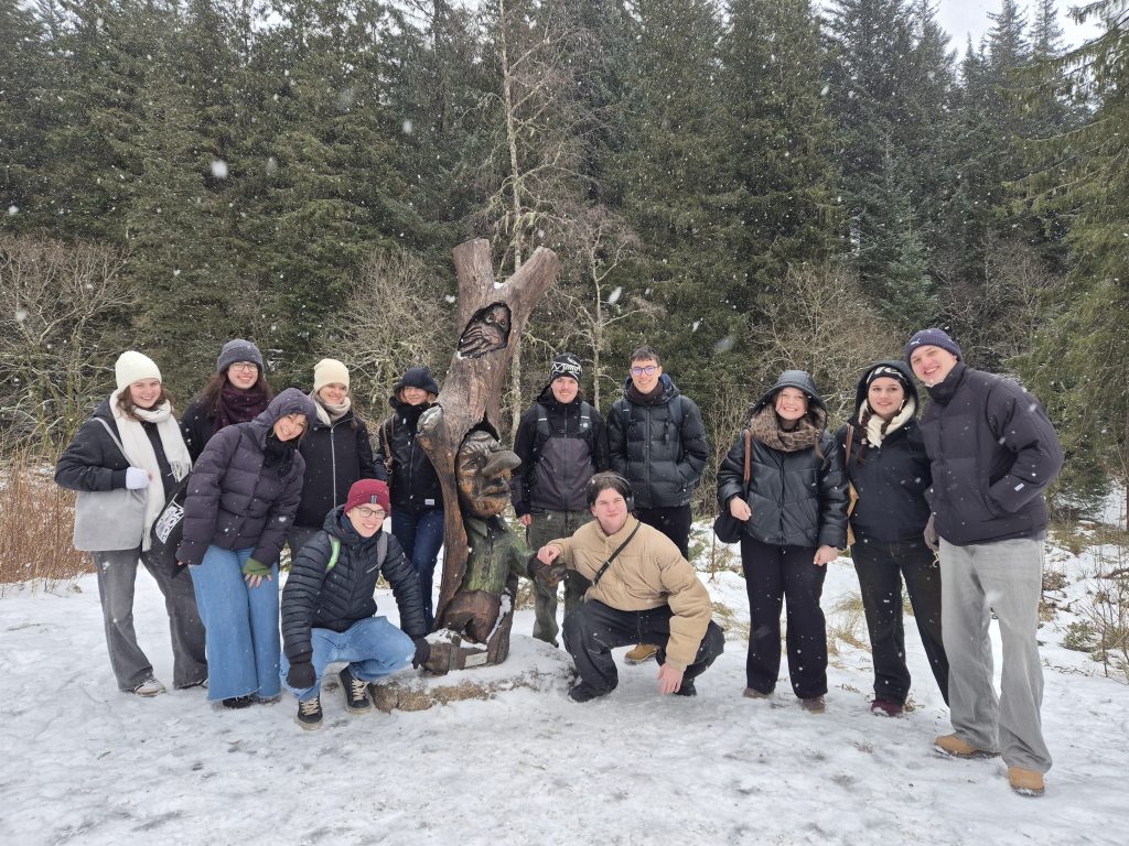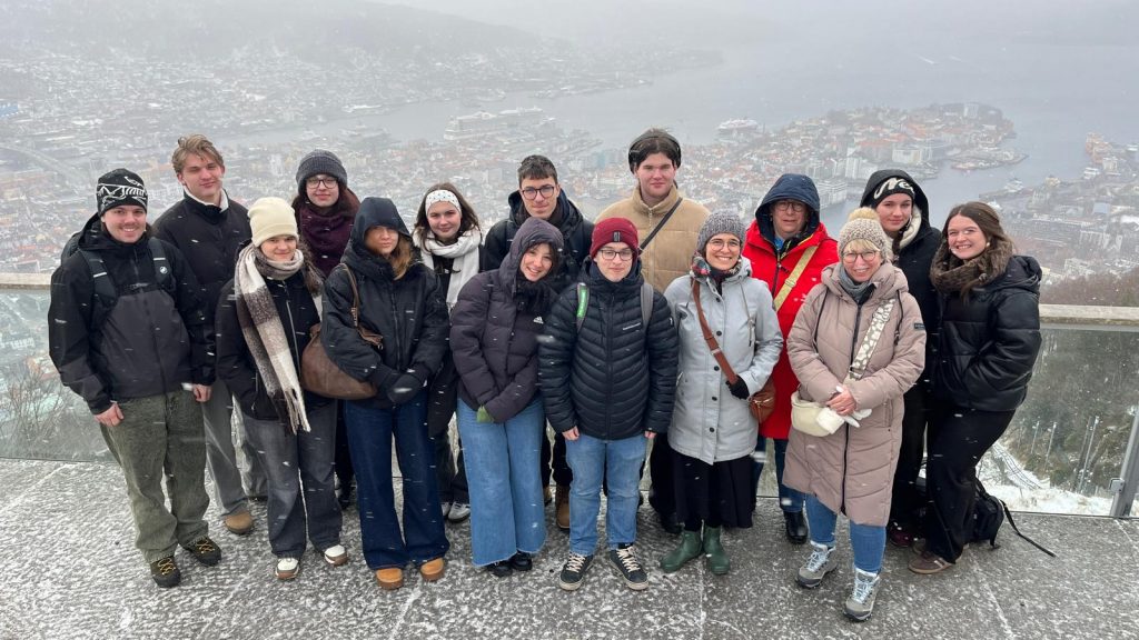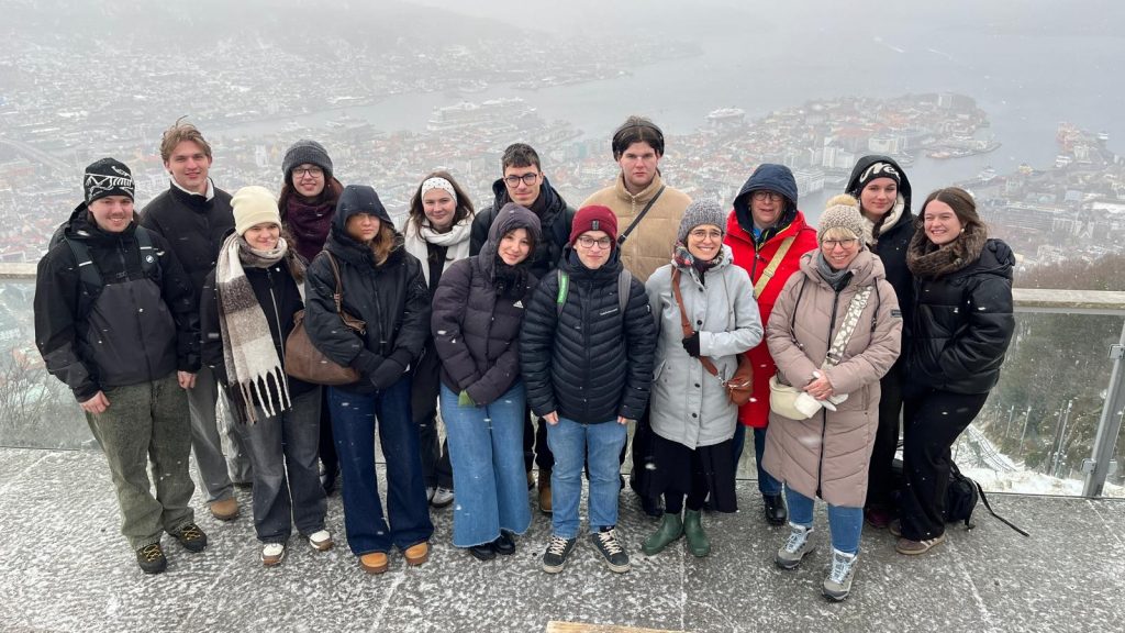 When school finished at 1:30 p.m., we took the ferry back to Bergen. After arriving at the harbor, we walked together to the Fløibanen. From there, we took the funicular up to Mount Fløyen. Fløyen is a mountain of about 400 meters in height, located in the northeastern part of the city. From the top, we enjoyed a breathtaking view and saw Bergen from a completely different perspective. Afterwards, we went on a short hike, during which we also walked around the lake “Skomakerdiket.”